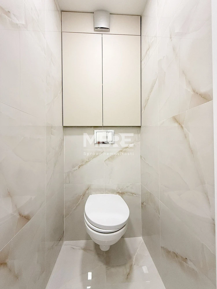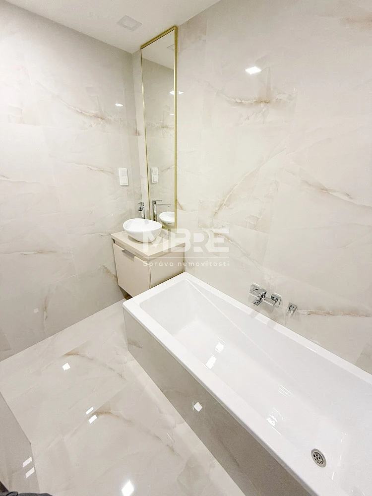 Byt působí velmi čistým, moderním a příjemným dojmem. Dominantou je stylová kuchyňská linka na míru vybavená vestavnými spotřebiči včetně elektrické a mikrovlnné trouby, myčky nádobí, chladničky s mrazákem, indukční desky a digestoře s elegantním LED podsvícením. Koupelna nabízí vanu a WC je samostatné. V celém bytě jsou položeny kvalitní plovoucí podlahy a dlažba, doplněné moderními dveřmi a osvětlením, díky čemuž interiér působí opravdu velmi útulně a nadčasově.