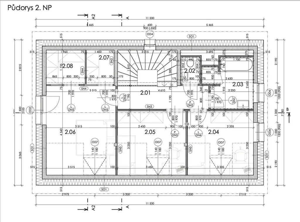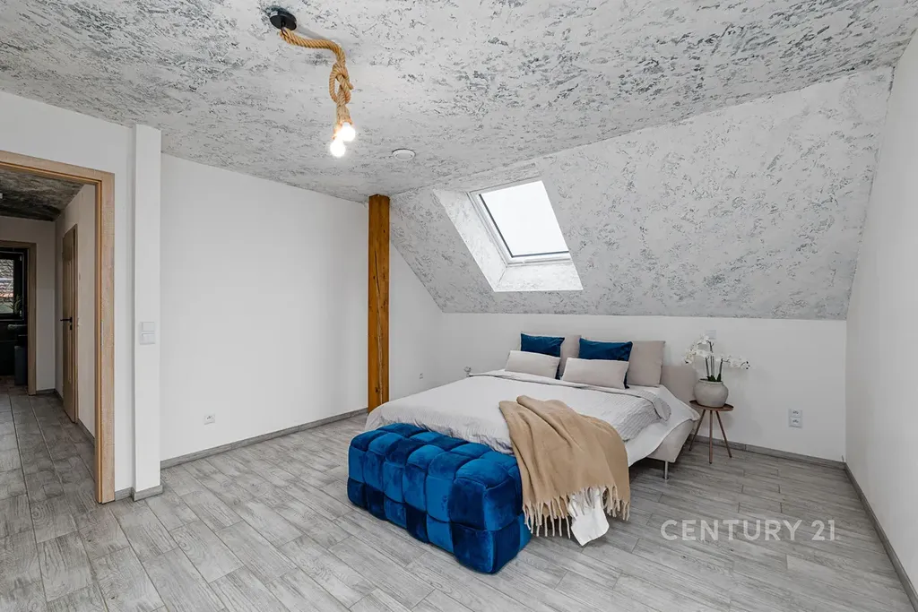 Dům je skvěle dispozičně řešen, v přízemí se nachází jeden samostatný pokoj, technické zázemí, koupelna a velmi vzdušný prostor obývací a jídelní části s kuchyňským koutem. Horní patro je členěno na dva samostatné pokoje, z nichž jeden má vlastní samostatnou šatnu. Dětský pokoj je uzpůsobený pro rozdělení na dva menší pokoje. Koupelnu s vanou a se sprchovým koutem a samostatnou toaletu.