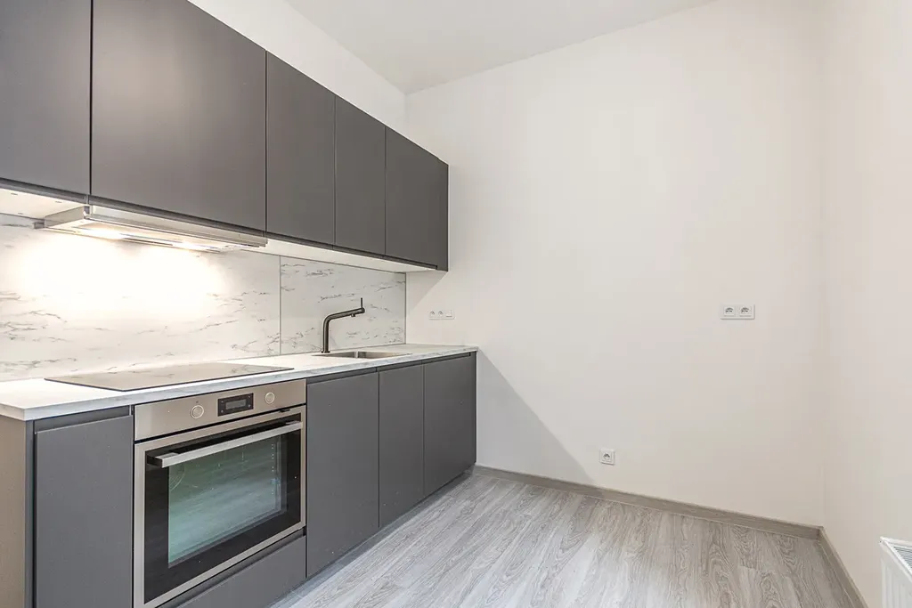 Při vstupu Vás přivítá chodba s přímým vstupem do koupelny, kde je k dispozici pračka se sušičkou. Dále se dostanete do kuchyňské části s nově zařízenou kuchyňskou linkou a vestavěnými spotřebiči: myčkou, lednicí s mrazákem, troubou a indukční varnou deskou.