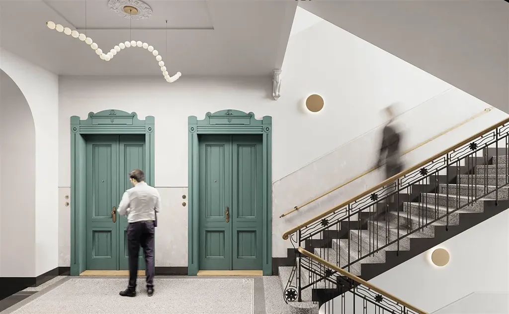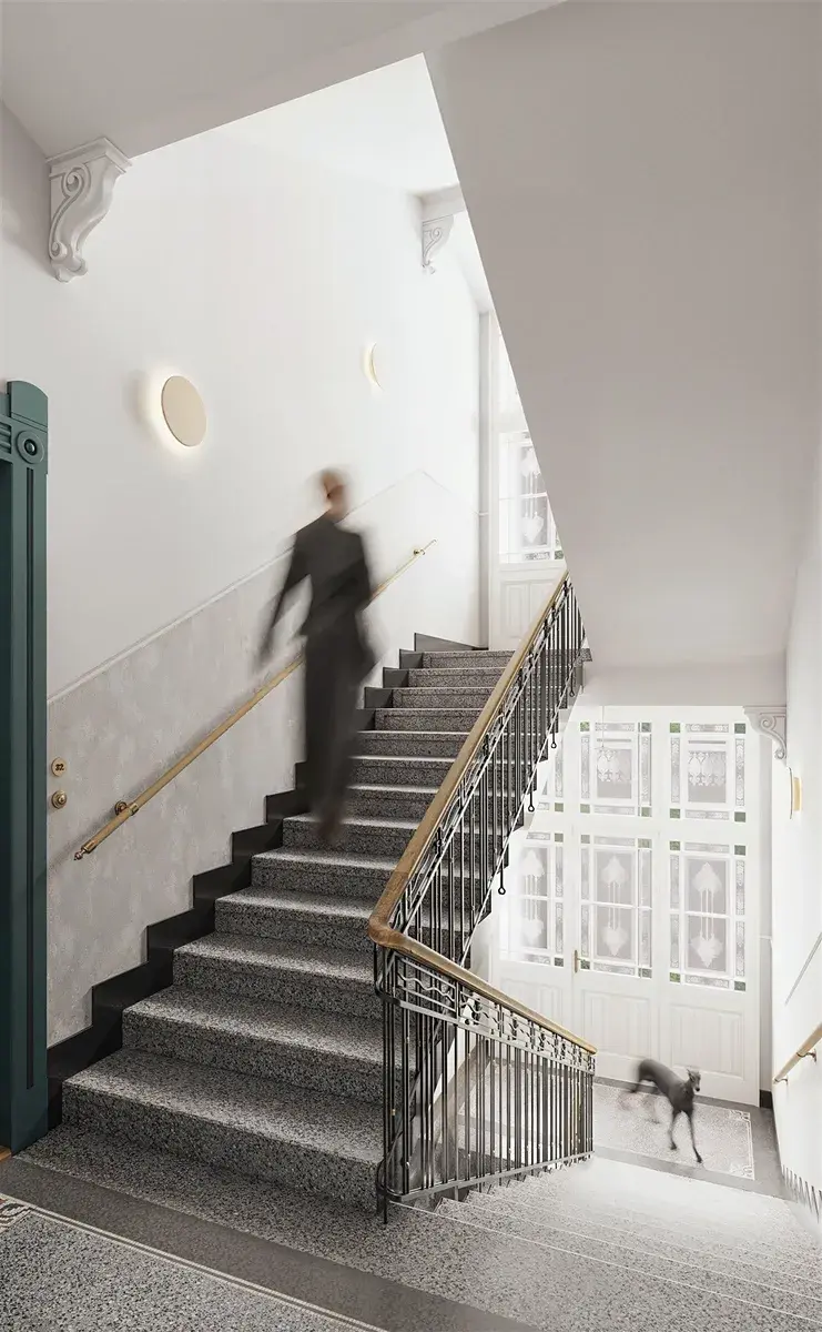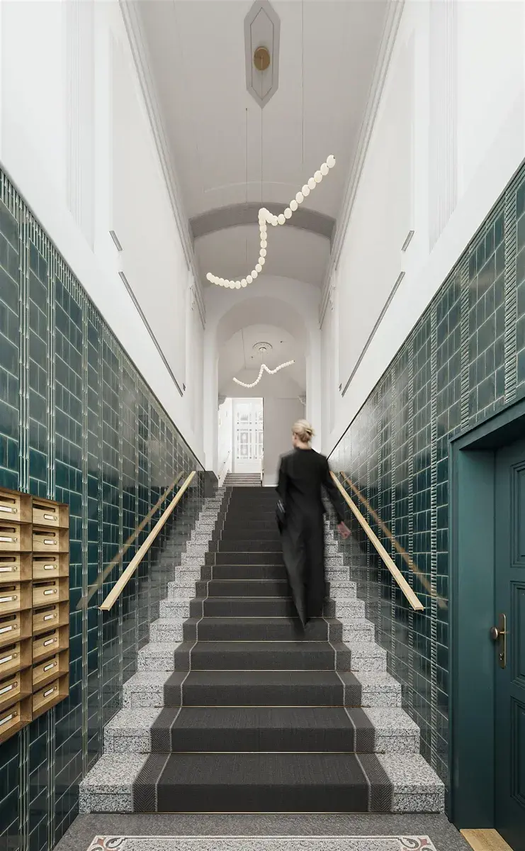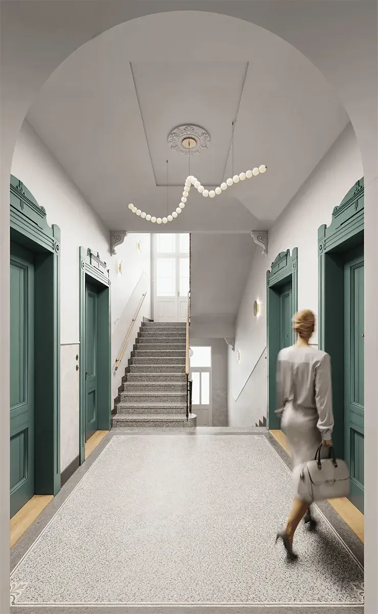 - Ve společných prostorech jsou použity materiály jako terazzo, broušené sklo či benátské štuky