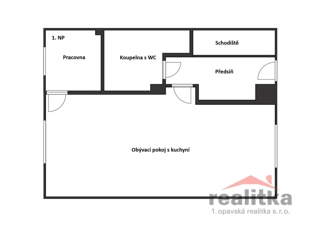 předsíň, obývací pokoj s kuchyňským koutem, pracovna, koupelna s vanou a WC.