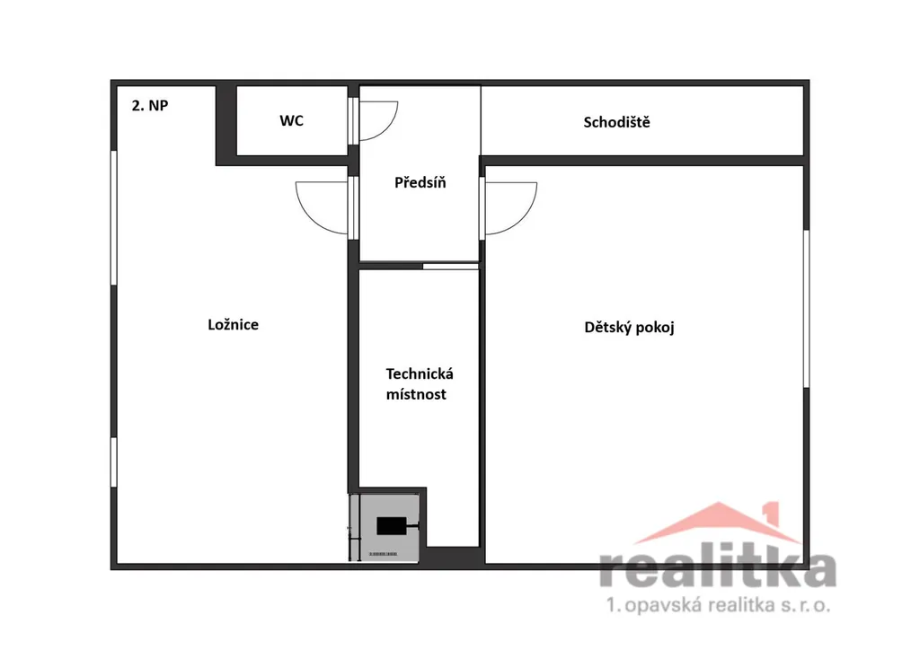 schodiště, chodba, ložnice se sprchovým koutem, dětský pokoj, technická místnost, samostatné WC.