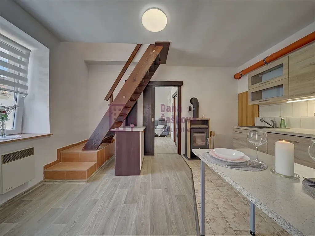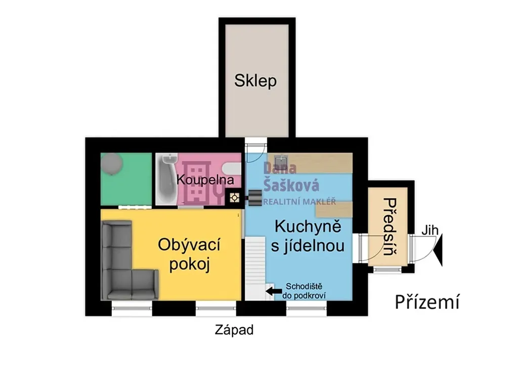 Z kuchyně v přízemí vedou schody do podkroví, kde se nachází velká ložnice o ploše 24 m2 se vstupem na terasu. Z kuchyně je dále vstup do sklepa o výměře 6 m2.