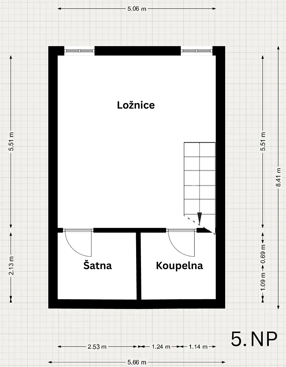 Druhé patro bytu tvoří velkorysá ložnice s kosmetickým koutem a velkou šatnou. Koupelna se sprchovým koutem a dvěma umyvadly.