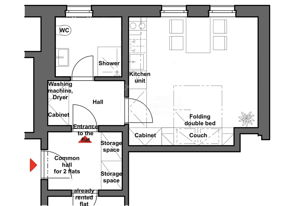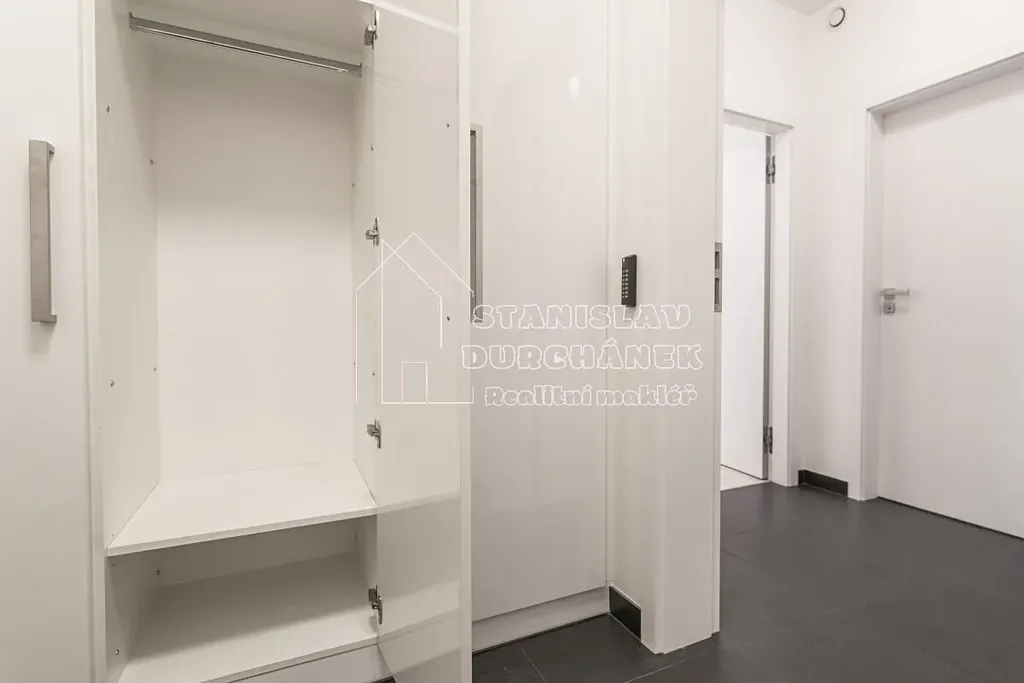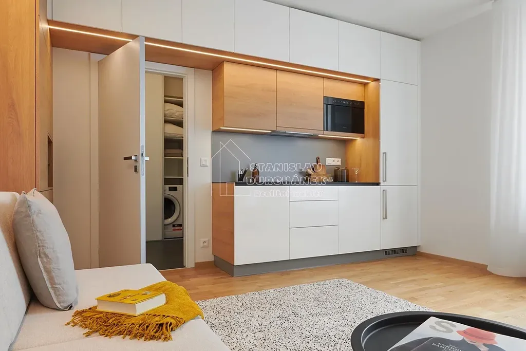 Byt bude pronajímán jako vybavený nábytkem i spotřebiči - velká skříňová stěna v obytném pokoji, pohovka s úložným prostorem, sklopná dvojpostel (200 x 180 cm) se zdravotní matrací, stůl, 2 židle, kuchyňská linka včetně vestavěných spotřebičů (lednička, mrazák, myčka, indukční varná deska, digestoř, mikrovlnná trouba s funkcí grilu). Ve vstupní chodbě je vestavěná skříň, ve které je umístěna i pračka se sušičkou (v jednom). Koupelna je se sprchovým koutem a WC.