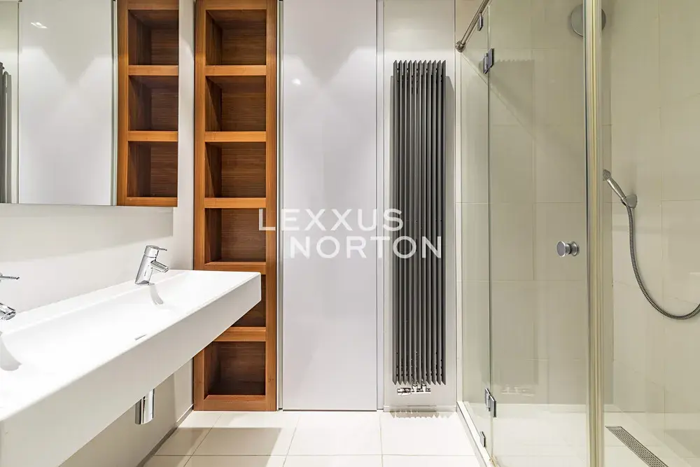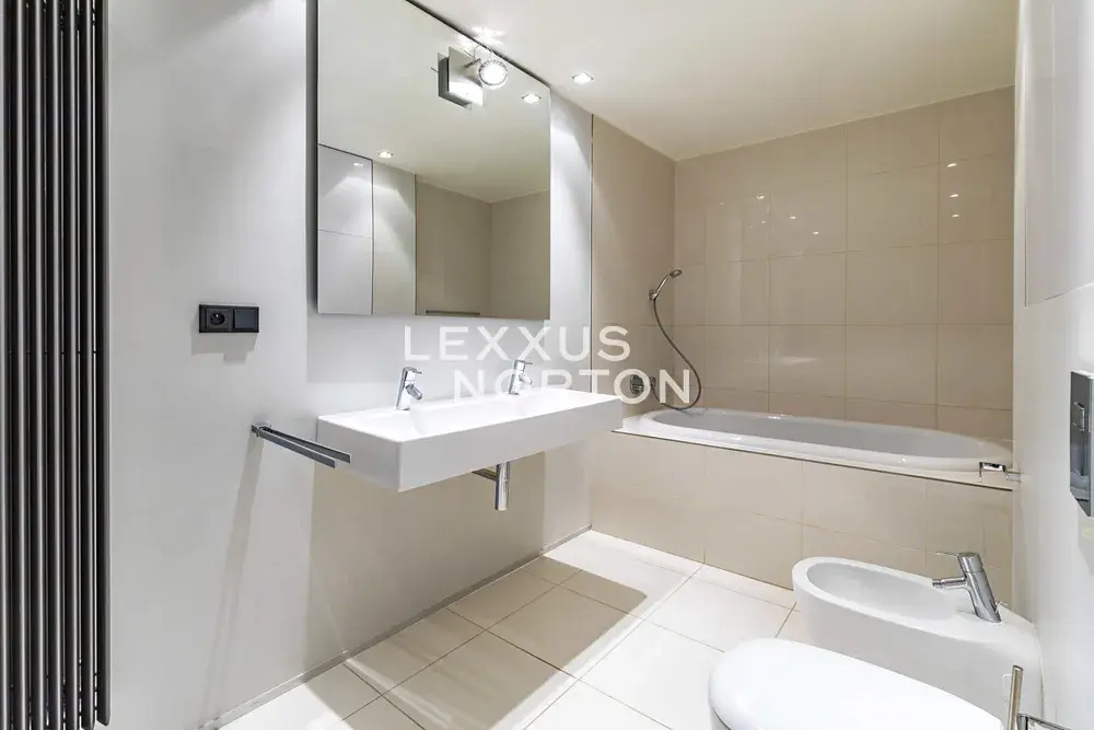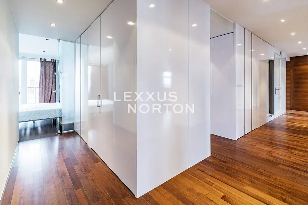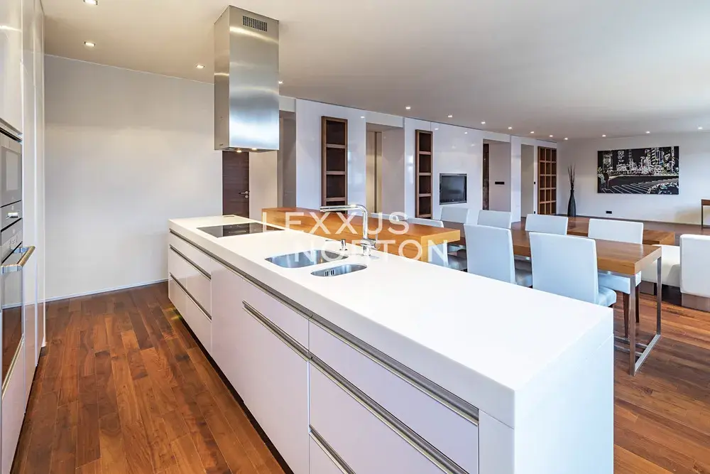 K vybavení kompletně zařízeného bytu patří ořechové podlahy, vestavěné skříně s dostatkem úložného prostoru, pračka a sušička. Samozřejmostí je podlahové vytápění, alarm a videotelefon. První koupelna je vybavena vanou, dvojumyvadlem, toaletou a bidetem, druhá pak nabízí prostorný sprchový kout s dvojumyvadlem.