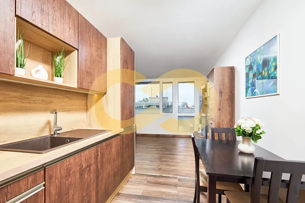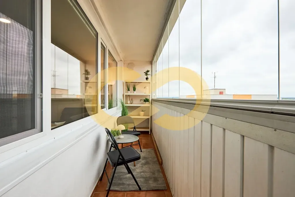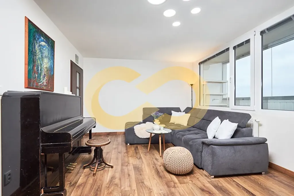 Byt má dispozici 4+kk a celkovou výměru 94 m² . Je tu velký obývací pokoj s kuchyní, tři pokoje, koupelna, oddělené WC a na chodbě komora. A to nejlepší? Dvě velké zasklené lodžie.