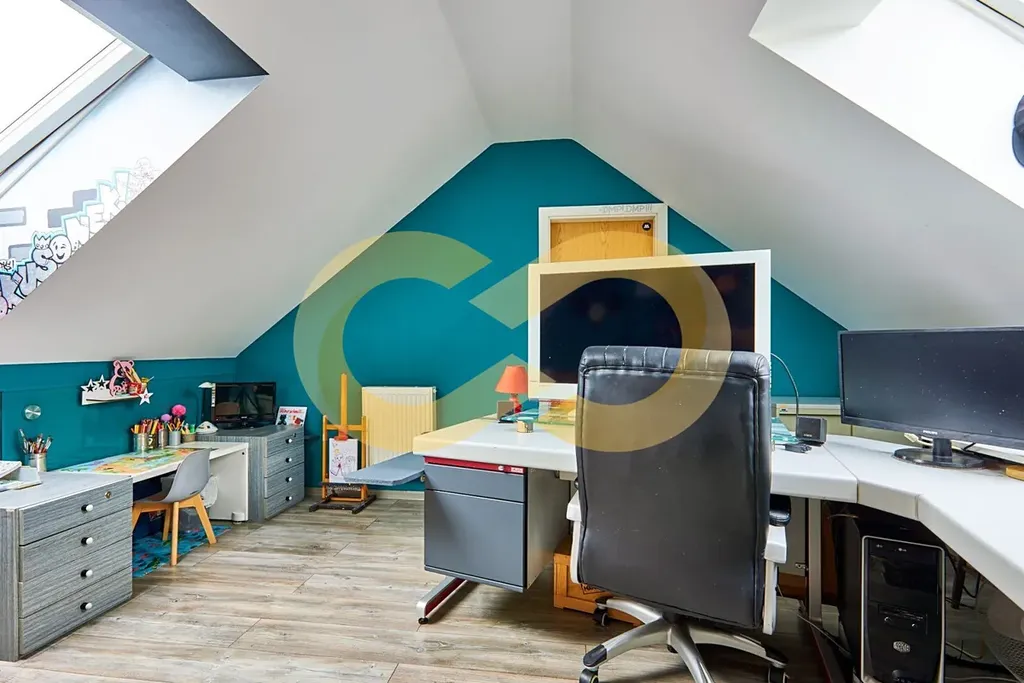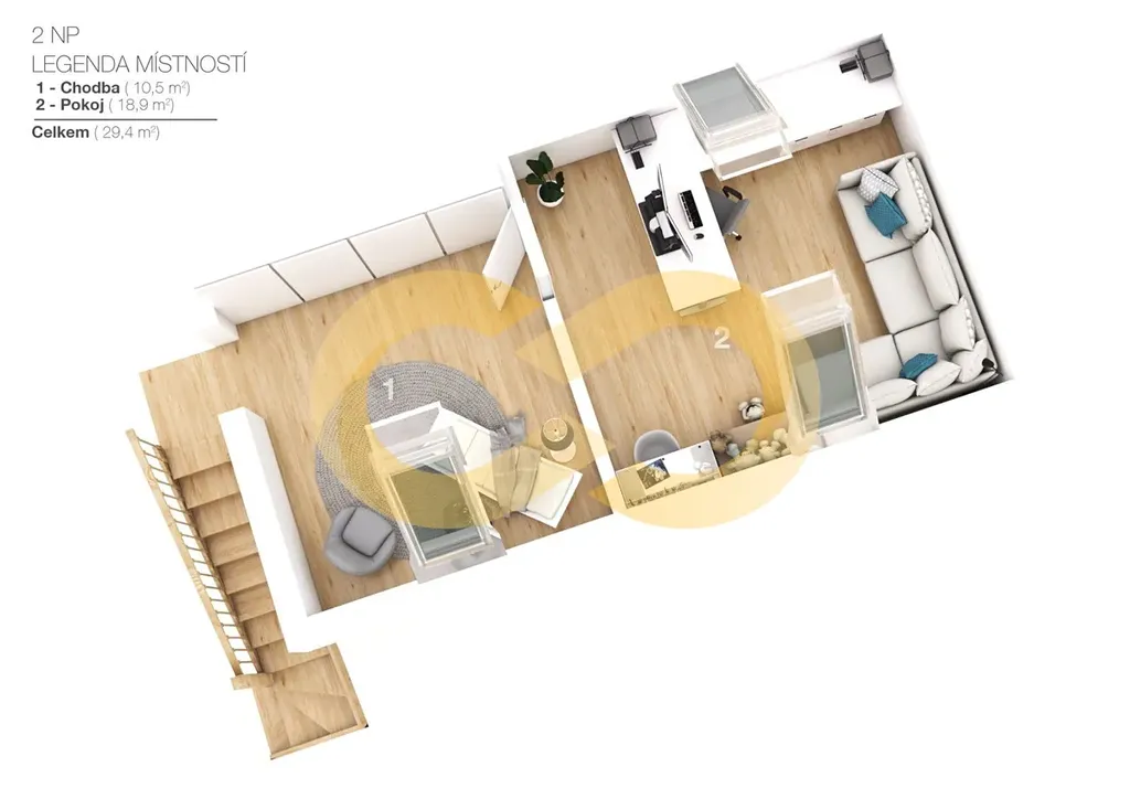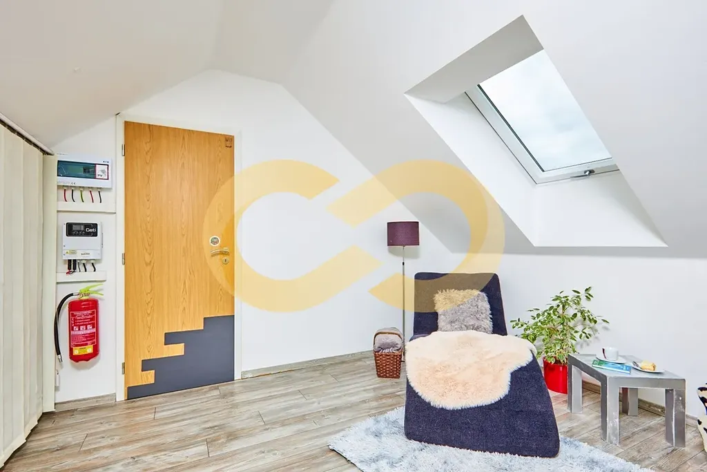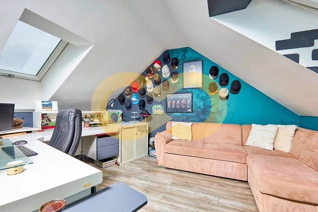 Dominantou domu je světlý obývací pokoj otevřený do krovu, díky čemuž působí prostorně, svěže a velmi moderně. Schodiště zde vede do otevřené pracovny, která se dívá přímo do obývacího prostoru. Je to ideální místo pro home office, klidné studium nebo knihovnu, kde se budete cítit nerušeně, ale stále propojeni s centrem dění v domě.