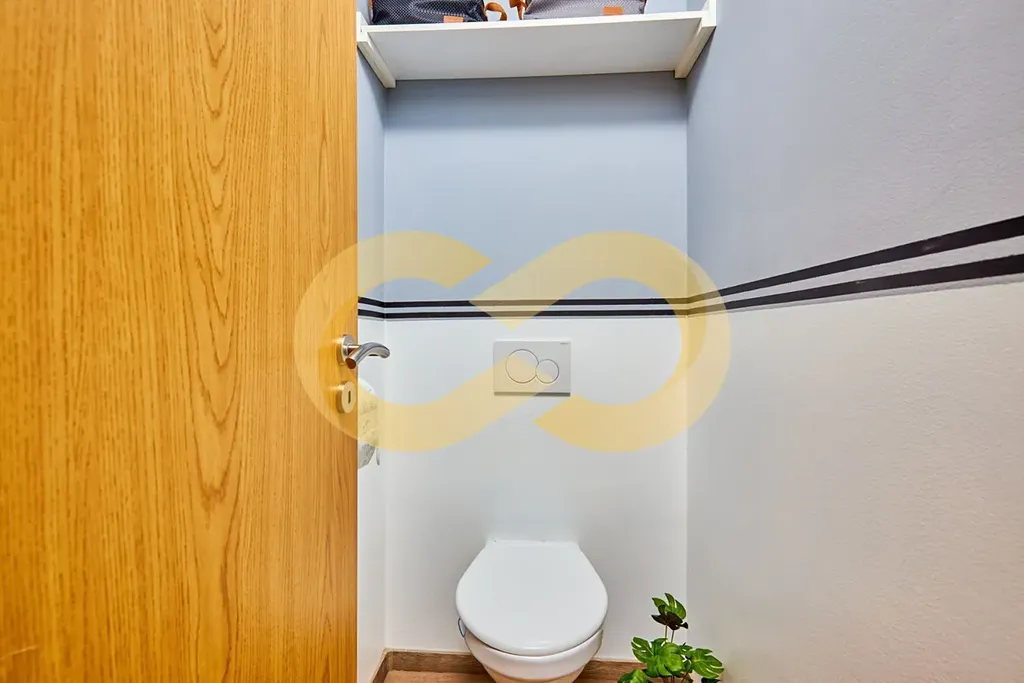 V přízemí najdete ložnici a dětský pokoj, oba s přímým vstupem na zahradu. Ranní káva na trávě? Děti běžící rovnou ven? Tady je to realita. K tomu nechybí ani koupelna a praktická spíž u kuchyně.
