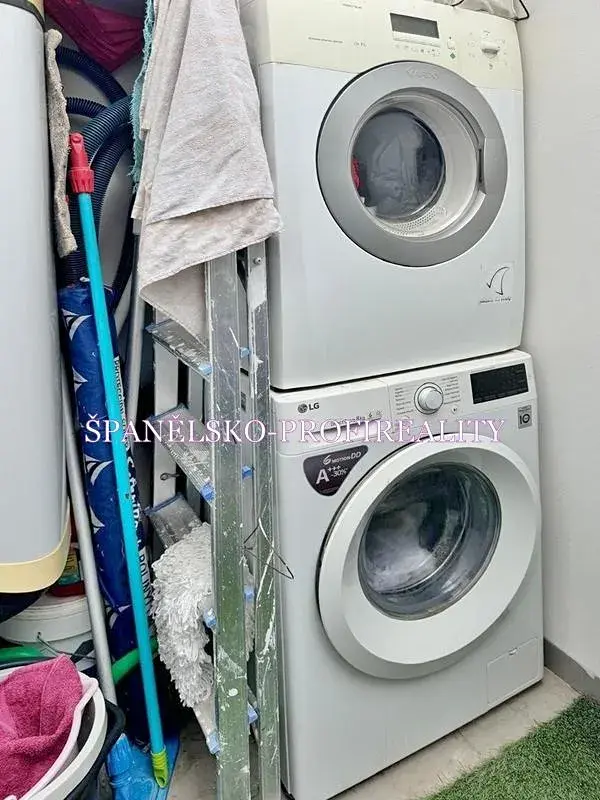 Malá místnost s pračkou a sušičkou.