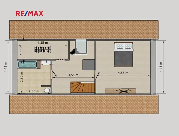 Stropy jsou dřevěné, trámové, zaklopené sádrokartonem s izolací. Kuchyňská linka je