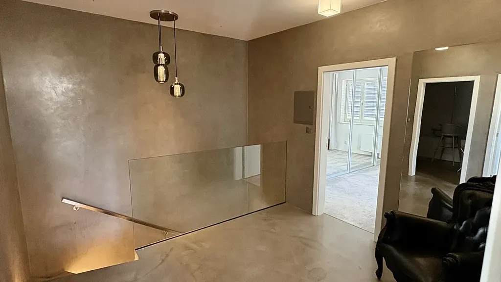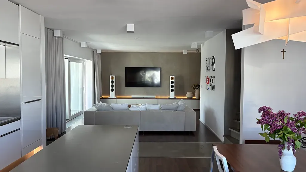 Prostřední patro zahrnuje velký obývací prostor s kuchyní a jídelnou, denní koupelnu se sprchovým koutem a wc, skryté vestavěné skříně v chodbě a úklidovou místnost pod schody. Je odsud přístup na zahradu, jenž nabízí absolutní soukromí díky vysokým cypřišům a prostorné částečně kryté terasy, které přímo vybízí ke grilování a relaxu.