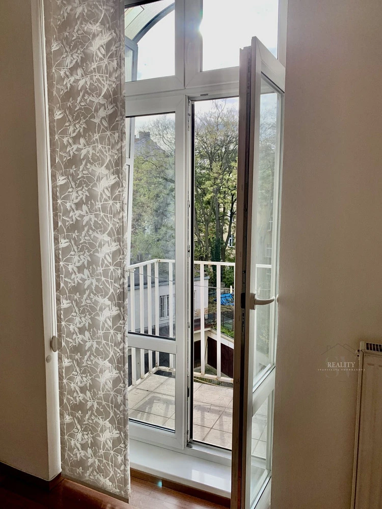 Okna obývací části směřují do ulice Francouzská, která je živější a nabízí veškerou městskou vybavenost doslova u dveří. Díky menším oknům a odhlučněným tramvajovým kolejím je však v bytě hluk výrazně tlumen. Ložnice je orientovaná do klidného vnitrobloku, kde se nachází i balkon, vhodný například na květiny nebo krátké posezení.