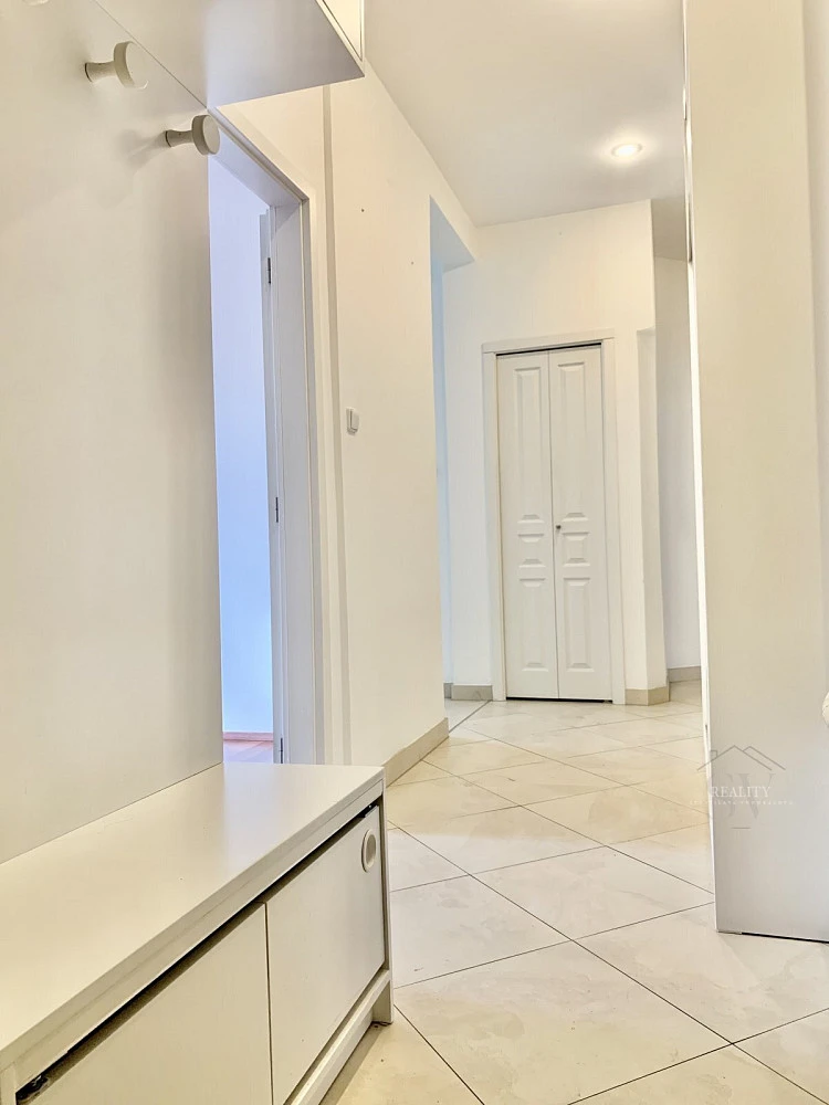 Dispozice bytu je velmi praktická — jednotlivé místnosti jsou propojeny chodbou, ze které je vstup do koupelny se sprchovým koutem a WC, a také do samostatné šatny/komory, která nabízí další vítaný úložný prostor. V koupelně je k dispozici pračka. Vytápění bytu zajišťuje vlastní plynový kotel.