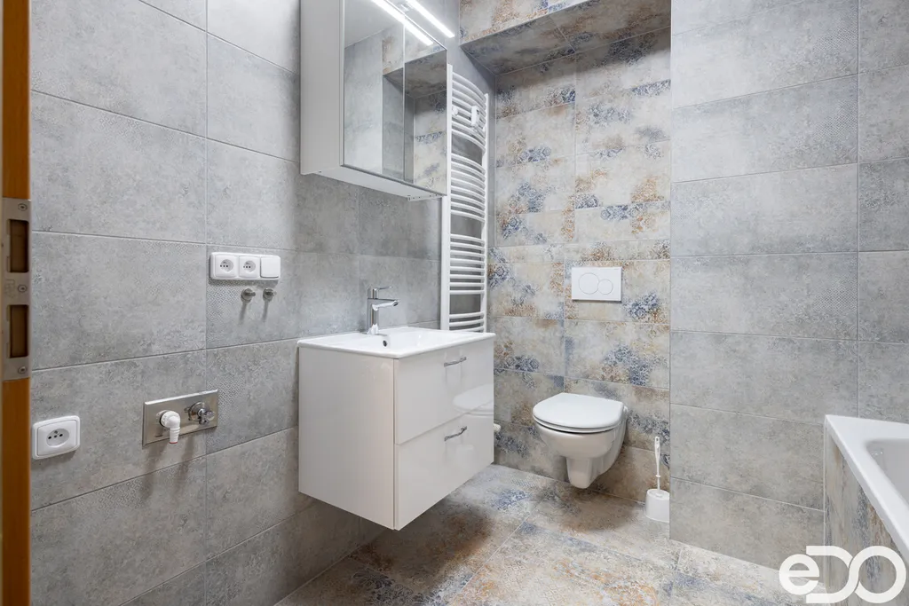 Koupelna je zařízena vanou a připravena na pračku. WC je součástí koupelny.