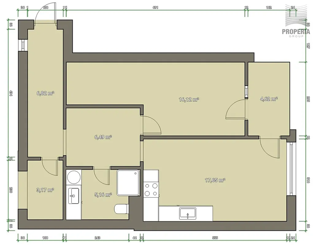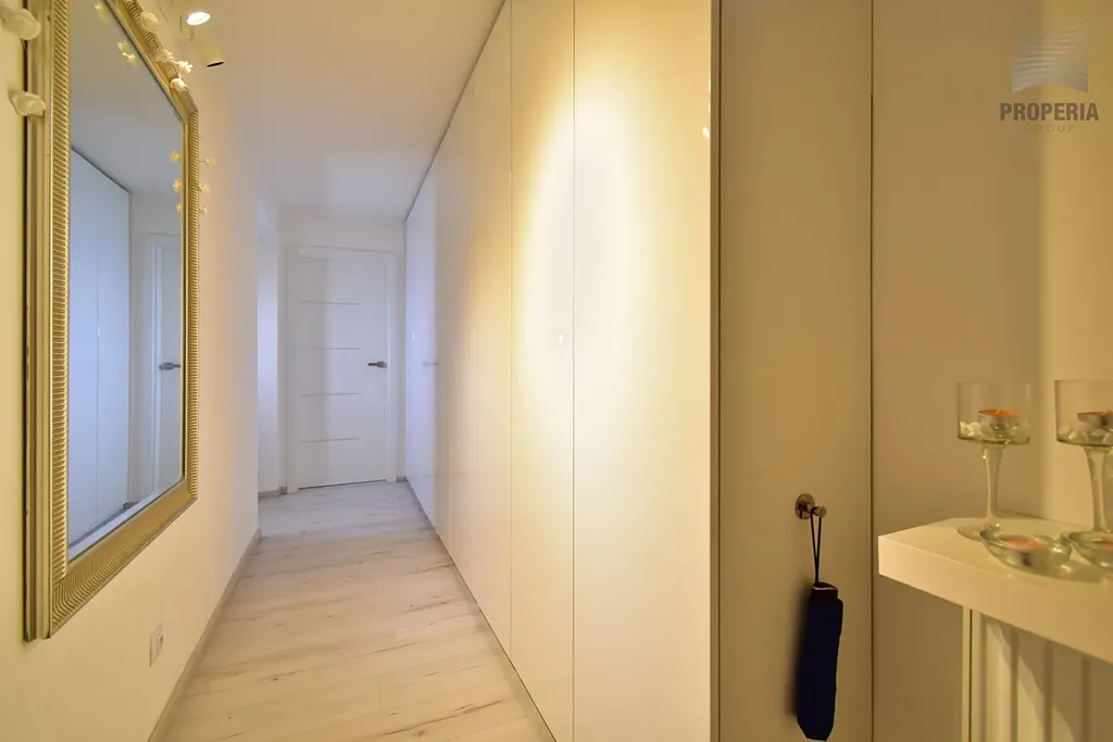 Dispozice vstupní chodba s úložným prostorem, obývací pokoj s kuchyní (vybavenou spotřebiči) a balkonem. Samostatná prostorná ložnice, šatna a v chodbě možnost pracovního koutku.