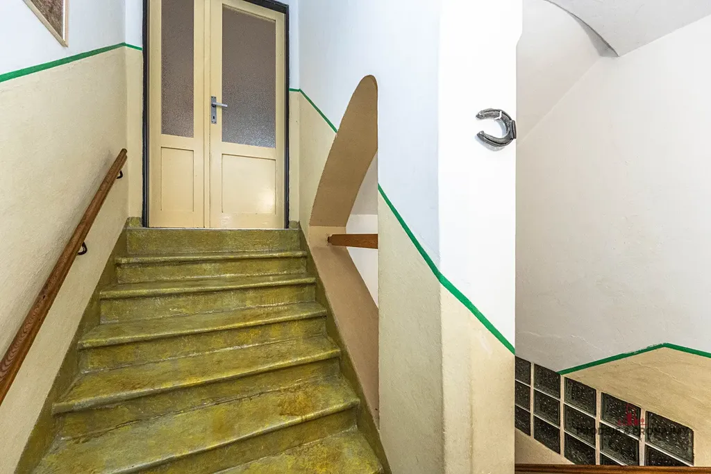 Po schodišti se dostanete do 1. patra kde se nachází obývák, dvě oddělené ložnice, kuchyně, WC, samostaná koupelna se sprchovým koutem, vstup na uzavřenou zahradu, která přímo sousedí s místním klášterem.