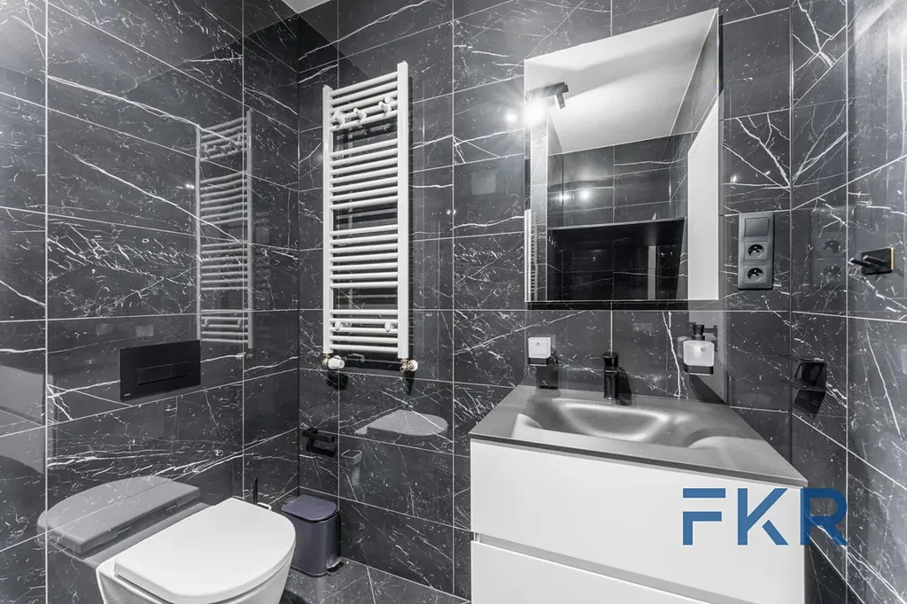 Dispozice bytu je řešena s důrazem na funkčnost a komfort. Vstupní chodba navazuje na praktickou komoru a moderní koupelnu se sprchovým koutem, toaletou a umyvadlem.
