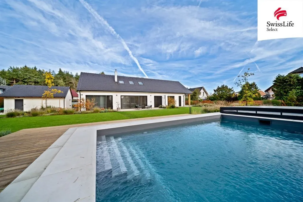Hlavní dům o dispozici 5+kk a ploše 159 m nabízí prostorný obývací pokoj s vysokými stropy, elektricky ovládanými střešními okny a krbem. Dále dvě koupelny, samostatné WC, pracovnu, ložnici, dva dětské pokoje a technickou místnost. Podlahové topení s tepelným čerpadlem, příprava na klimatizaci a moderní technologie zajišťují úsporný provoz. Dům je částečně vybavený a připravený k nastěhování. Nadstandard podtrhují hliníkové dveře na míru a špičkové technologie.