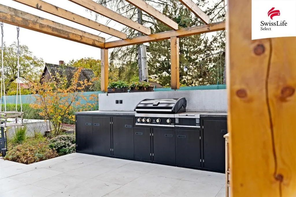 Dům se nachází v klidné části obce a má vlastní osvětlenou příjezdovou cestu, což zajišťuje maximální soukromí. Na pozemku nechybí kryté parkování pro dvě auta, venkovní bazén s tepelným čerpadlem, okrasná zahrada se závlahou ze studny a stylový zahradní domek s výčepem, WC, krbem, grilem a krytým posezením. K dispozici je také samostatný zahradní domek.