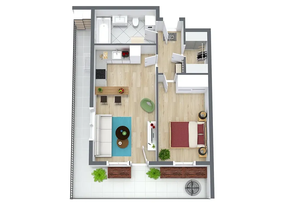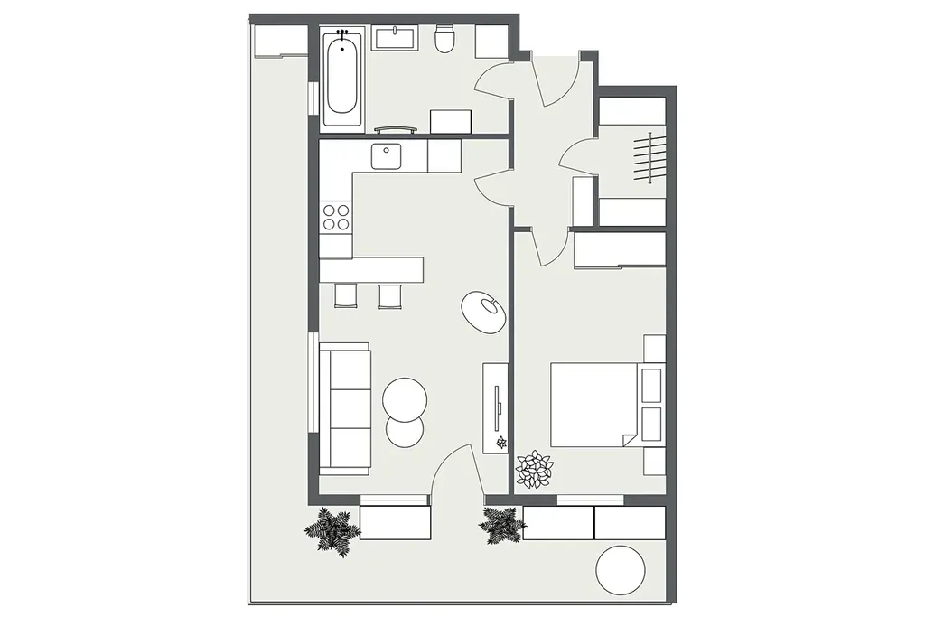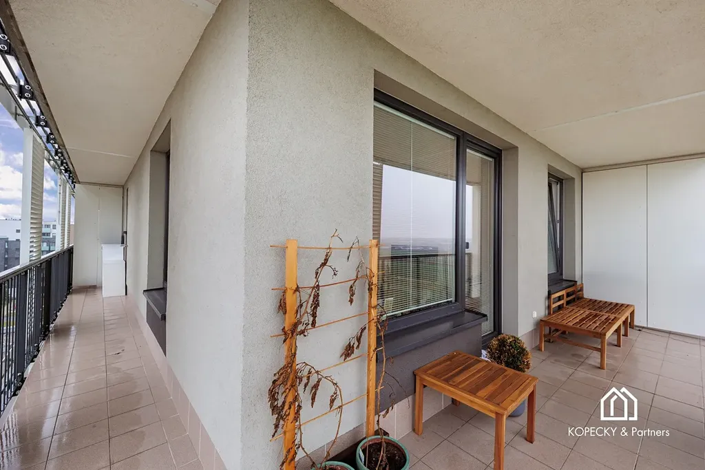 Dispozice bytu je navržená prakticky a s důrazem na každodenní komfort. Obývací část s kuchyňským koutem nabízí dostatek prostoru pro jídelní stůl i relaxační zónu, ložnice je samostatná a poskytuje klidné zázemí. Skutečnou přidanou hodnotou je prostorná terasa, která funguje jako druhý obývák v teplé části roku – ideální na ranní kávu, posezení s přáteli, zeleň i odpočinek po práci. Díky velikosti terasy získáváte pocit bydlení s venkovním prostorem, který se v Praze hledá čím dál hůř.