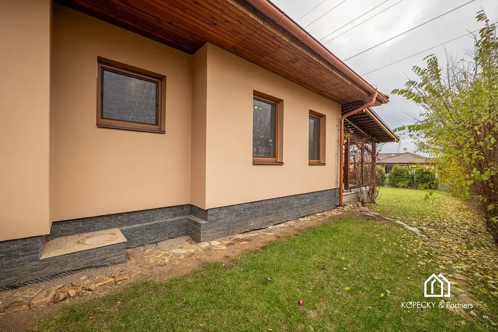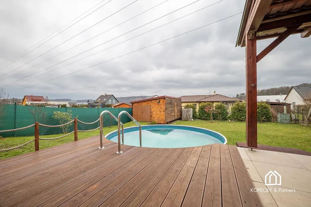 Dům s dispozicí 3+kk je umístěný na rovinatém pozemku o velikosti 678 m², který je kompletně oplocený a vybavený bránou na dálkové ovládání. Kromě garáže o ploše 30 m² nabízí pozemek také dostatek prostoru pro parkování dalších vozidel. Jižní orientace zahrady zajišťuje celodenní světlo, příjemnou atmosféru a komfort při každodenním užívání. Součástí je terasa navazující na obytnou část domu a venkovní bazén.