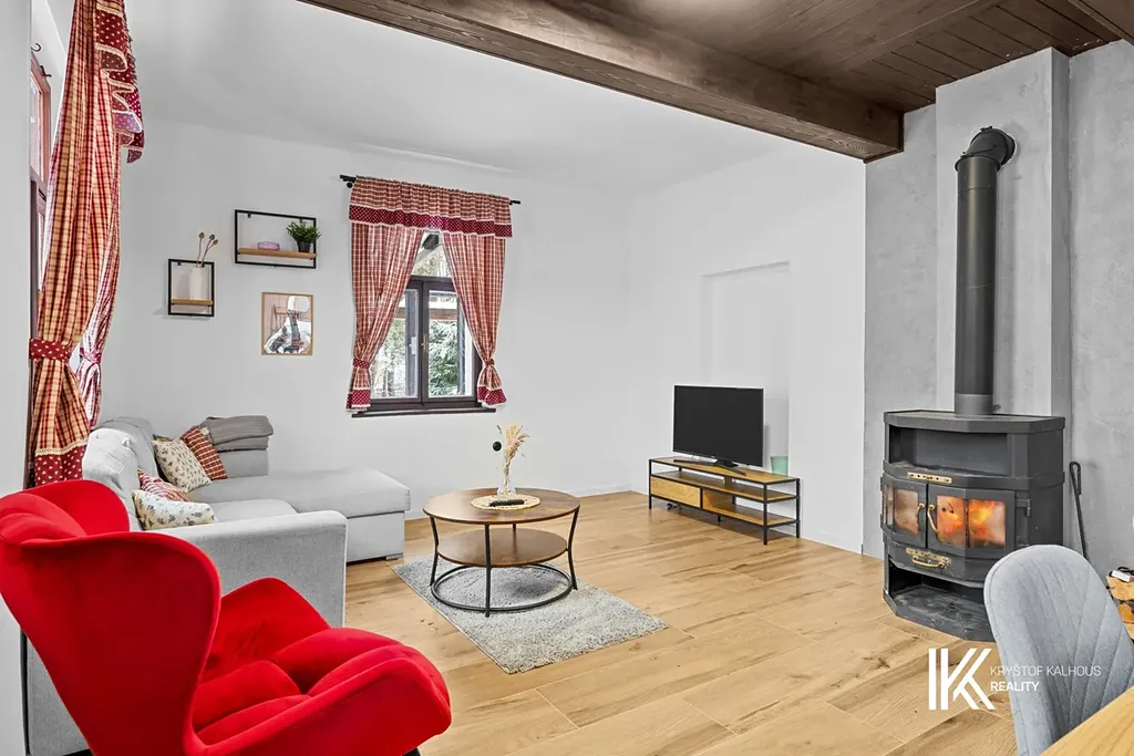 Na pozemku o celkové rozloze 739 m² stojí tato neobyčejná chalupa, která prošla v roce 2023 rozsáhlou rekonstrukcí. Zvenku působí jako klasická roubenka, ale za krásnou fasádou z techniky zkamenělého dřeva se skrývá moderní interiér. Trámy byly zachovány a ponechány přiznané, aby dům neztratil svůj charakter, původní okna dávají stavbě přirozenou atmosféru a nová plechová střecha zajišťuje dlouhou životnost. Dům je cihlový, pevný a připravený na dlouhá léta používání.