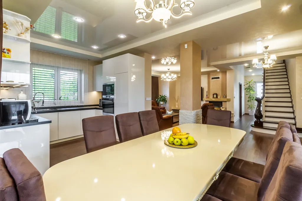 V přízemí domu vstupujete do haly, dále navazuje obývací pokoj s kompletně vybaveným kuchyňským koutem a jídelnou, ložnice, koupelna s WC a technická místnost ve které je umístěna pračka se sušičkou a výkonné tepelné čerpadlo napojené na teplovodní podlahové vytápění v obou podlažích. Z obývacího pokoje pokračujeme po otevřeném schodišti do horního patra s dispozicí 2x dětský pokoj, pracovna, ložnice, šatna a koupelna s WC.