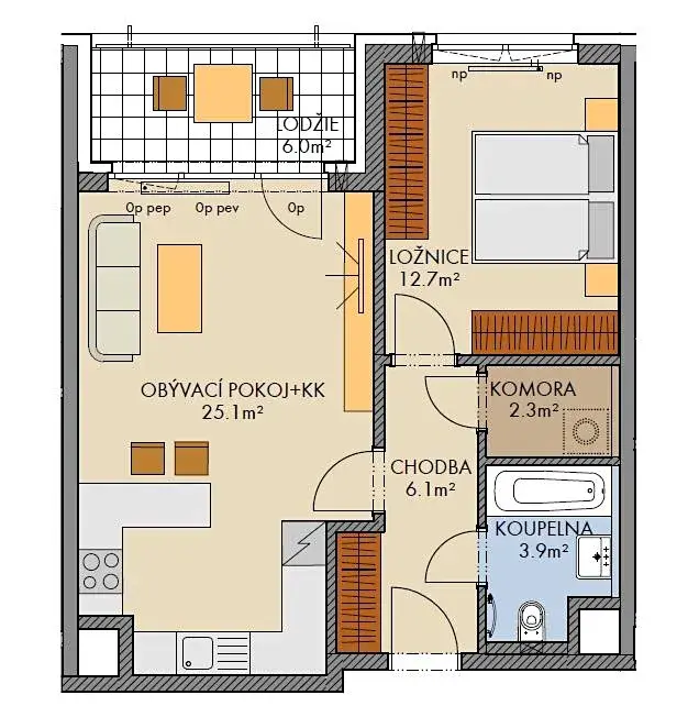 Dispozice bytu: obývací pokoj s kuchyňským koutem, ložnice, koupelna s WC, chodba, komora v rámci bytu, lodžie.