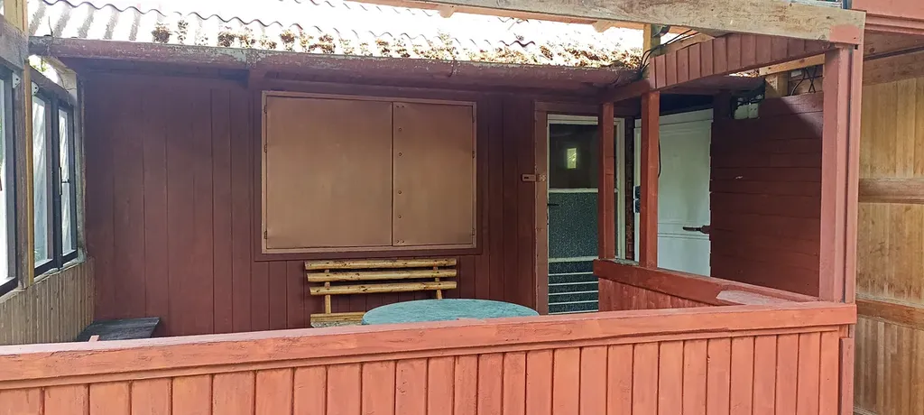 Před chatou se nachází zastřešená veranda a nová dřevěná terasa s krásným výhledem do okolních lesů – ideální místo pro klidné posezení, čtení nebo odpočinek.