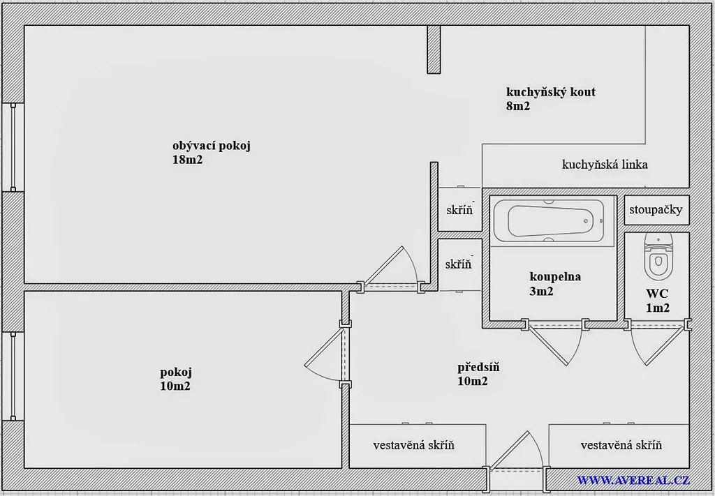 Dispozice: obývací pokoj s kuchyňským koutem (cca 26 m2), ložnice (10 m2), předsíň (10 m2), koupelna (3 m2) a samostatné WC (1 m2).