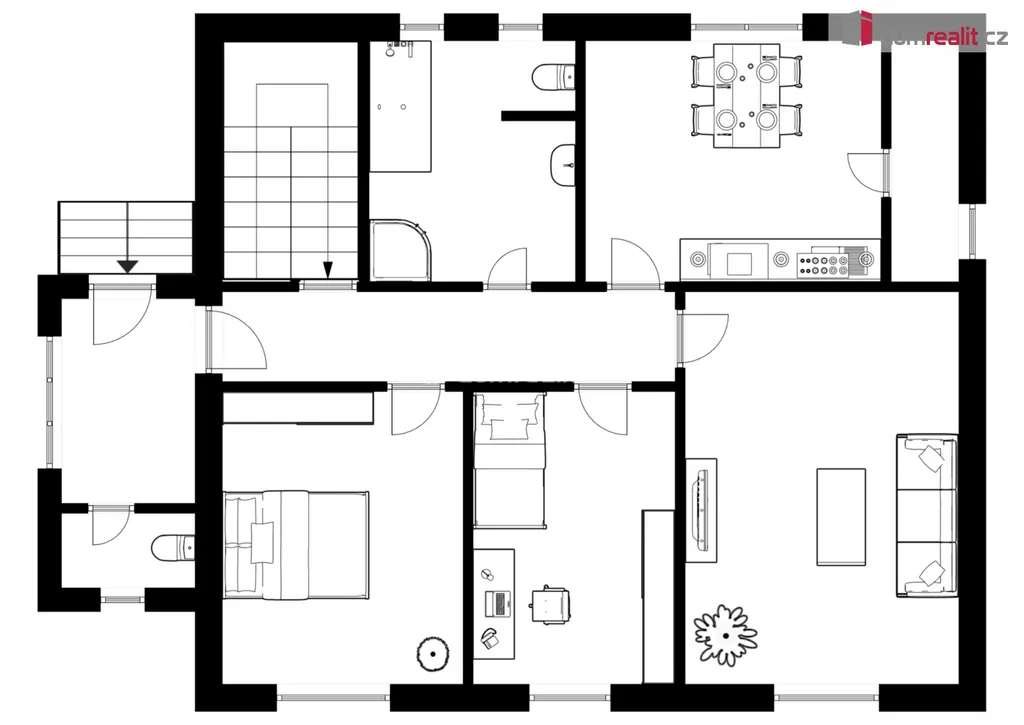 V 1.NP se nachází: vstupní veranda , samostatné WC , chodba, 3 pokoje, kuchyň, koupelna se sprchovým koutem, vanou a další toaletou, vstup do sklepa a do patra.