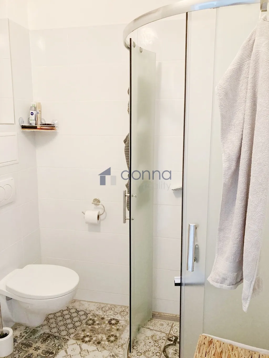 V koupelně je sprchový kout, pračka se sušičkou a toaleta.