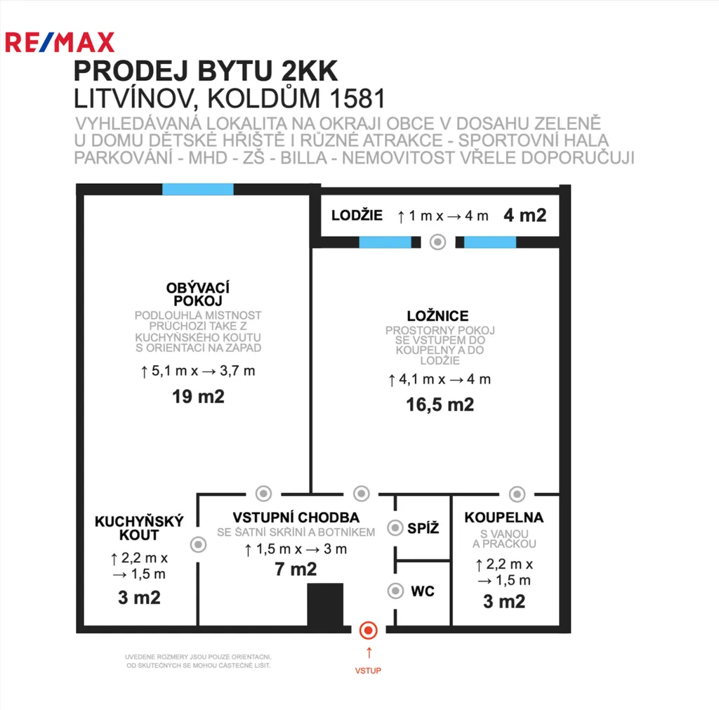 Byt se nachází v 7. patře na Koldůmu č. p. 1581, domu se správou SBD Krušnohor a díky vysokému podlaží nabízí příjemné světlo i hezký výhled. Součástí bytu je západně orientovaná lodžie, ideální pro večerní odpočinek u západu slunce.