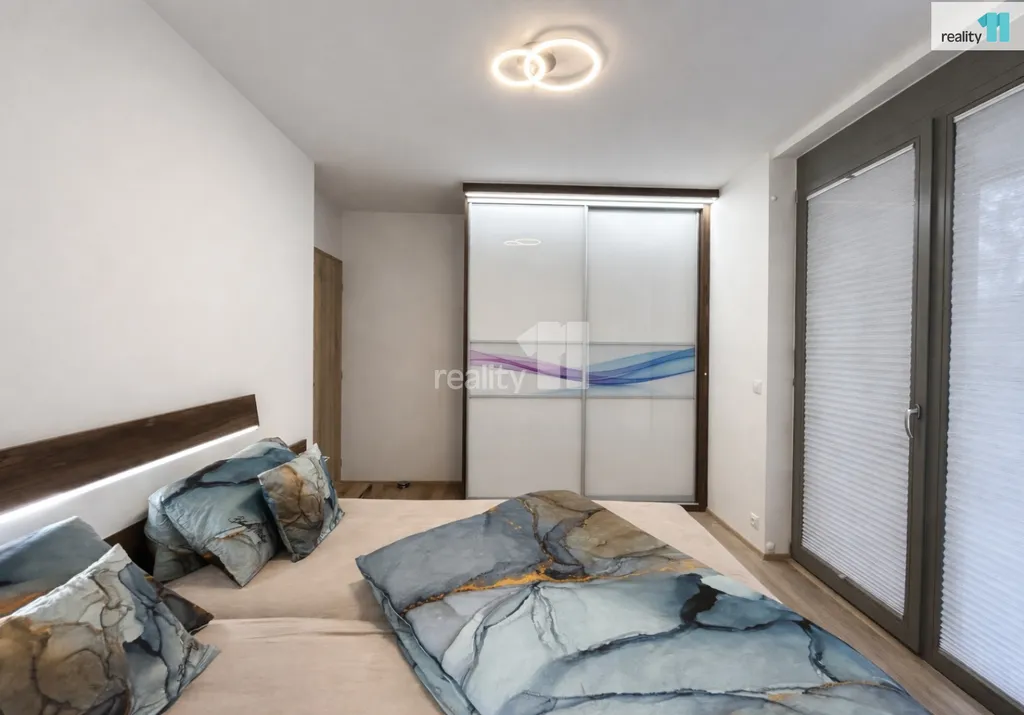 V ložnici je velká osvětlená vestavěná skříň, osvětlená manželská postel s kvalitními matracemi, nočními stolky a televizí na zdi.