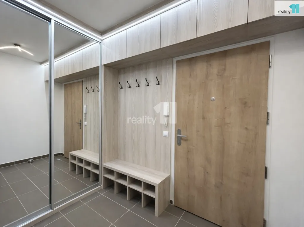 V chodbě jsou vestavěné osvětlené skříně, botník.