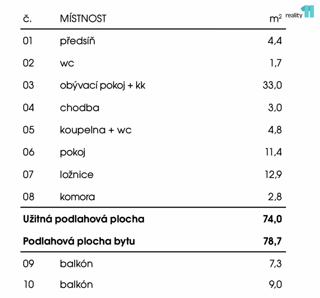 Podlahová plocha bytu činí 78,7 m², užitná plocha 74 m².
