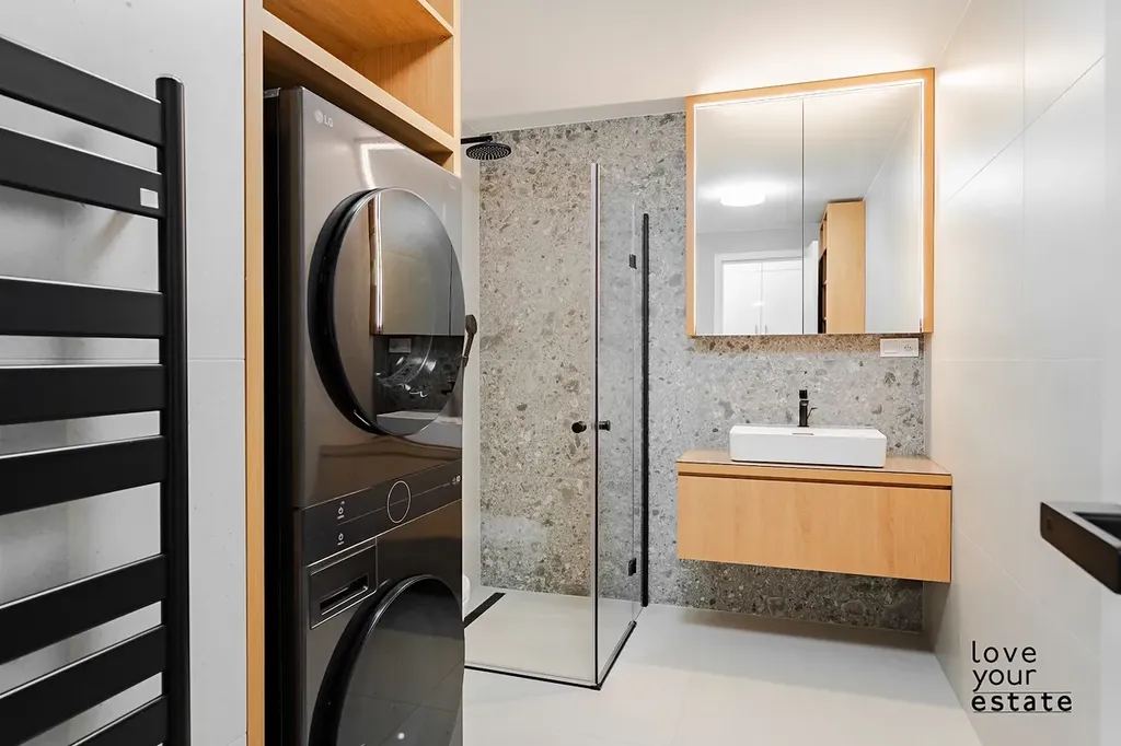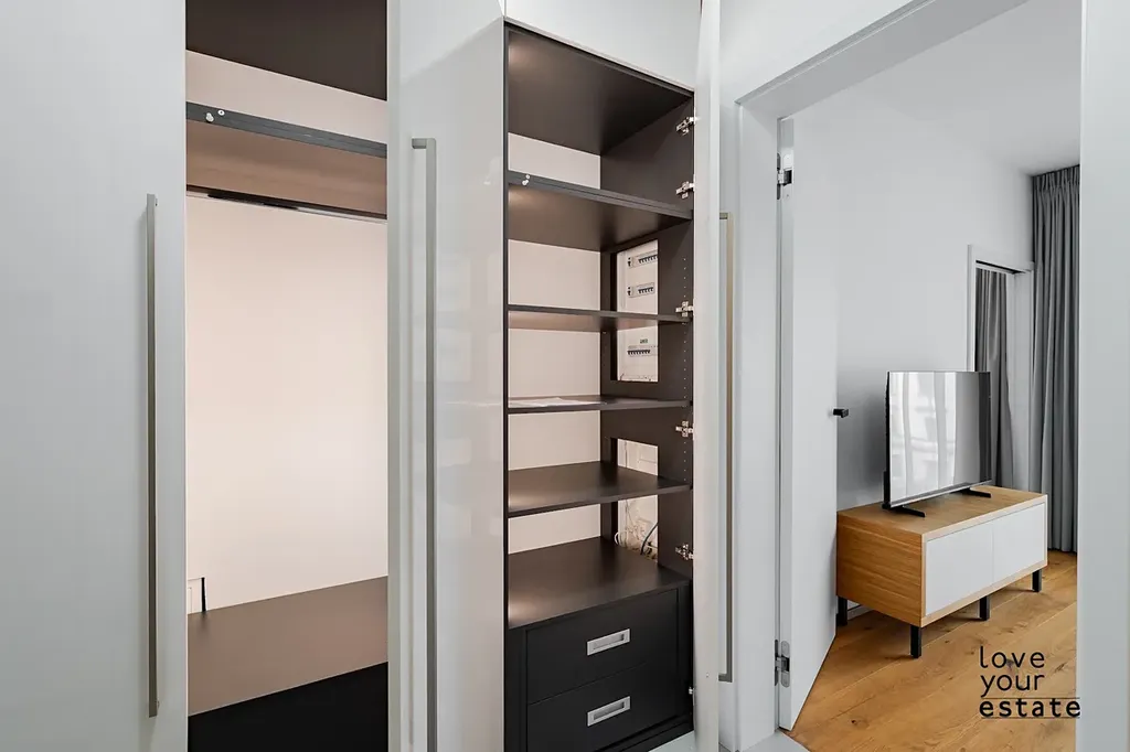 Byt sestává z předsíně s vestavěnými skříněmi až ke stropu, v obývací části je plně vybavená kuchyň na míru (spotřebiče Siemens - varná deska, trouba, lednice s mrazákem, myčka, Nespresso kávovar), mnoho úložných prostor na nádobí, sedačka, jídelním kout, TV stolek s TV, v ložnici je manželská postel 180cm a další vestavěné skříně. V oknech záclony a zatemńovací závěsy blackout v ložnici. V koupelně je sprchový kout, WC, mnoho úložných prostor, pračka a sušička LG. Veškeré vybavení z fotek zůstává v bytě. V případě zájmu lze za poplatek byt dovybavit nádobím, povlečením atd...