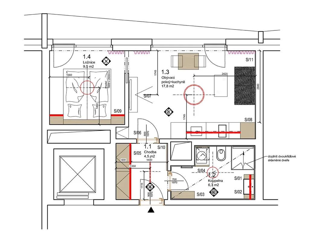 V bytě jsou v obou pokojích velká hliníková francouzská okna, dřevěná podlaha s integrovaným topením, rekuperace, nadstanadardní vybavení koupelny - obklady i sanita, bezfalcové dveře.