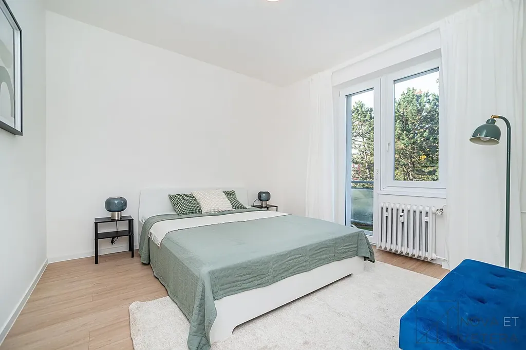 Jednotka je orientována na dvě světové strany - západ a sever. Světlý obývací pokoj disponuje vstupem na lodžii o velikosti 6 m² a s odděleným kuchyňským koutem. K dispozici jsou tři samostatné pokoje, které mohou sloužit jako ložnice, dětský pokoj, pracovna nebo pokoj pro hosty. Dva z pokojů mají vlastní vstup na lodžii, jedna o velikosti 3 m² a druhá 4,5 m². Moderní koupelna je vybavena sprchovým koutem a toaletou, druhá toaleta je samostatná. Vstupní chodba a samostatná místnost, která může sloužit jako komora nebo šatna nabízí dostatek úložného prostoru.