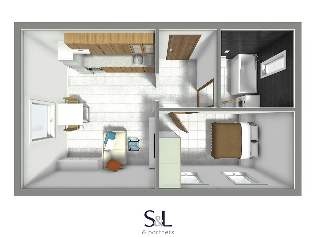Jedná se o bytovou jednotku v prvním nadzemním podlaží. Dispozici tvoří pokoj se zařízenou kuchyňskou linkou s elektrickým sporákem včetně digestoře a lednici. Moderní koupelna s vanou, wc, umyvadlem a pračkou. Samostatný pokoj jako ložnice.