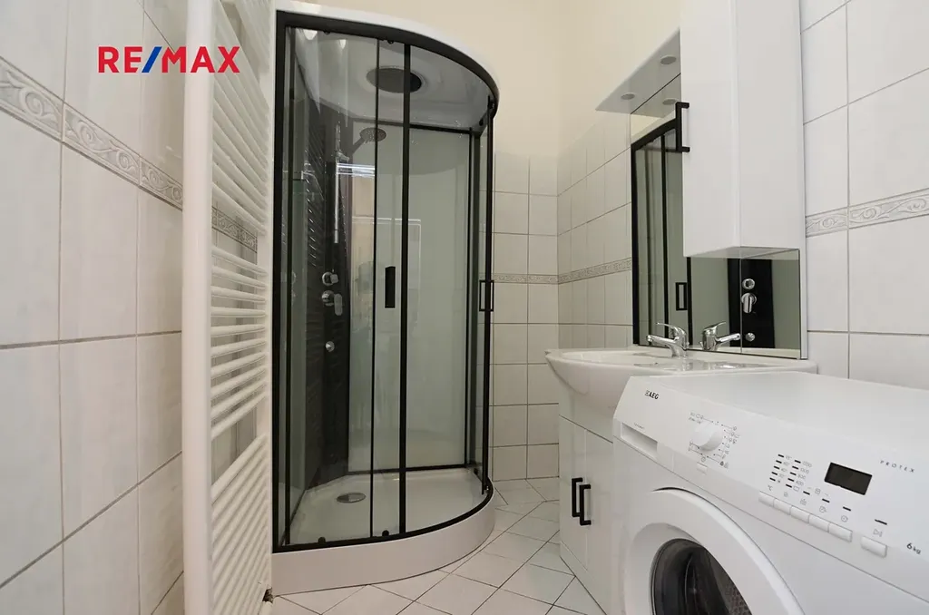 Nová koupelna se sprchovým koutem a umyvadlem. WC zvlášť.