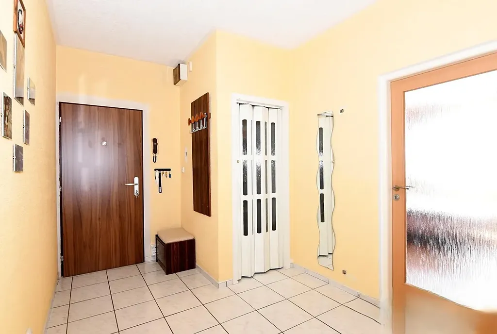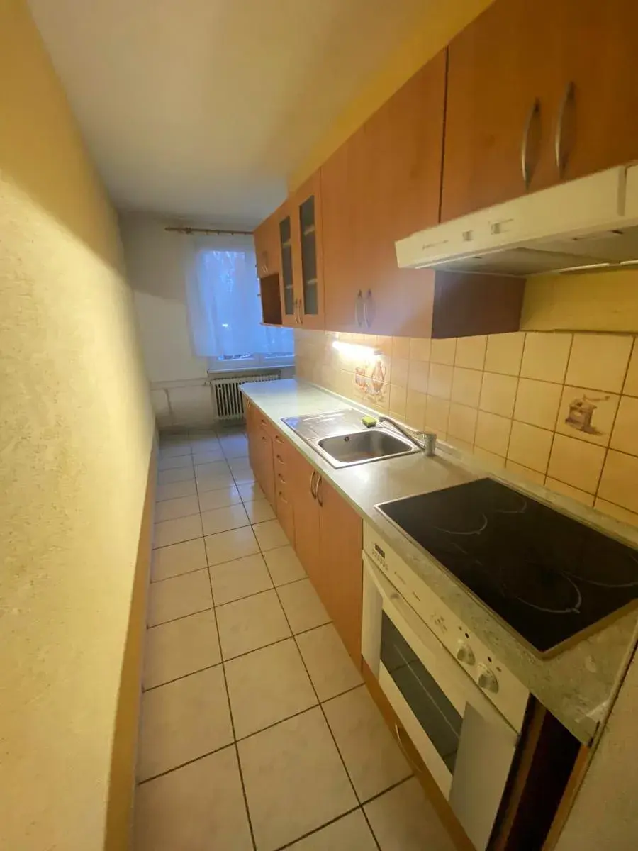 Bytová jednotka má 3 neprůchozí pokoje s větší chodbou. V kuchyni je hezká kuchyňská linka s elektrickým sporákem a digestoří.
