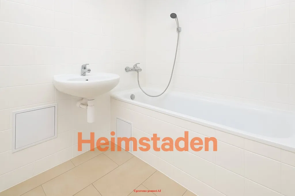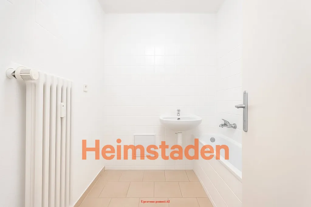 Koupelna je opravdu velkorysá – bílé obklady, vana a dostatek místa, žádné kompromisy. Byt je světlý, vzdušný a nachází se na vyvýšeném přízemí, které zajišťuje soukromí i příjemné světlo po celý den.