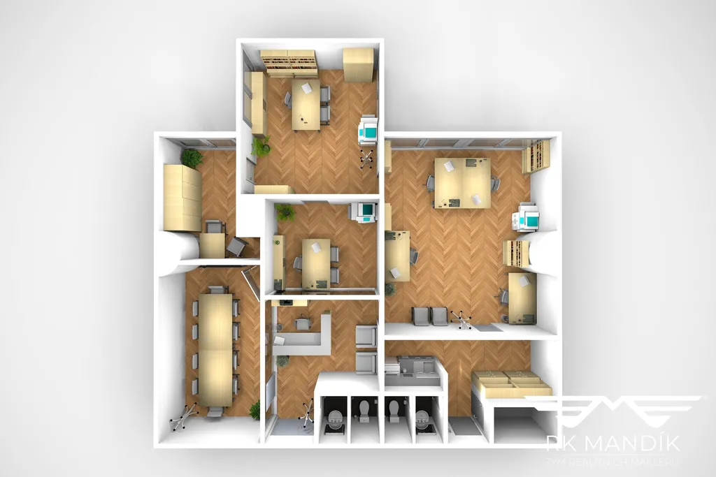 Dispozice je navržena s důrazem na funkčnost a vysoký standard pracovního prostředí. Součástí jsou dvě samostatné kanceláře, dvě zasedací místnosti, recepční část, vlastní kuchyňka, dvě sociální zařízení, serverovna a samostatná trezorová místnost splňující přísné bezpečnostní požadavky pojišťoven. Prostory jsou vybaveny moderním bezpečnostním systémem a nabízejí nadčasový, reprezentativní vzhled. Stávající moderní úpravy včetně vstupních dveří a recepce může nový nájemce ponechat a dále využívat.