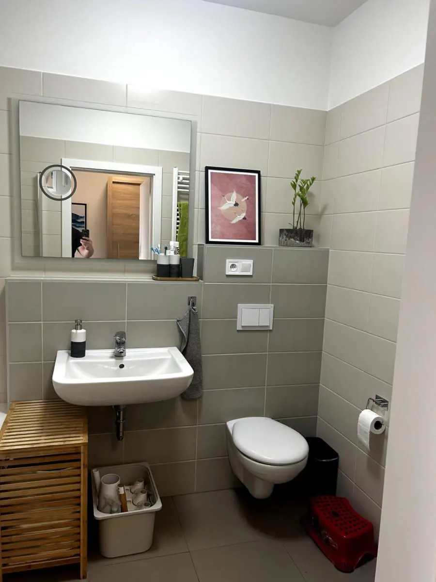 Dispozice bytu je praktická a moderní. Po vstupu se ocitnete v předsíni, ze které je přístup do koupelny s vanou a toaletou, do ložnice a do obývacího pokoje s kuchyňským koutem. Kuchyň je vybavena kvalitní kuchyňskou linkou Hanák a vestavěnými spotřebiči Electrolux. V bytě jsou dřevěné podlahy, žaluzie, kvalitní interiérové dveře a díky orientaci bytu je zajištěn krásný výhled a dostatek soukromí.