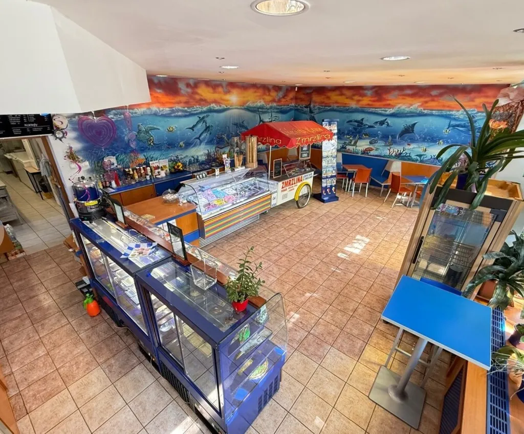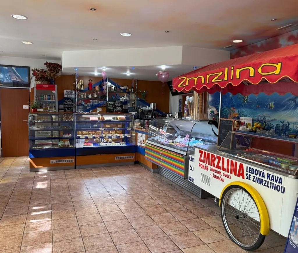 - kompletně vybavený interiér – nábytek, vitríny na zákusky i zmrzlinu
