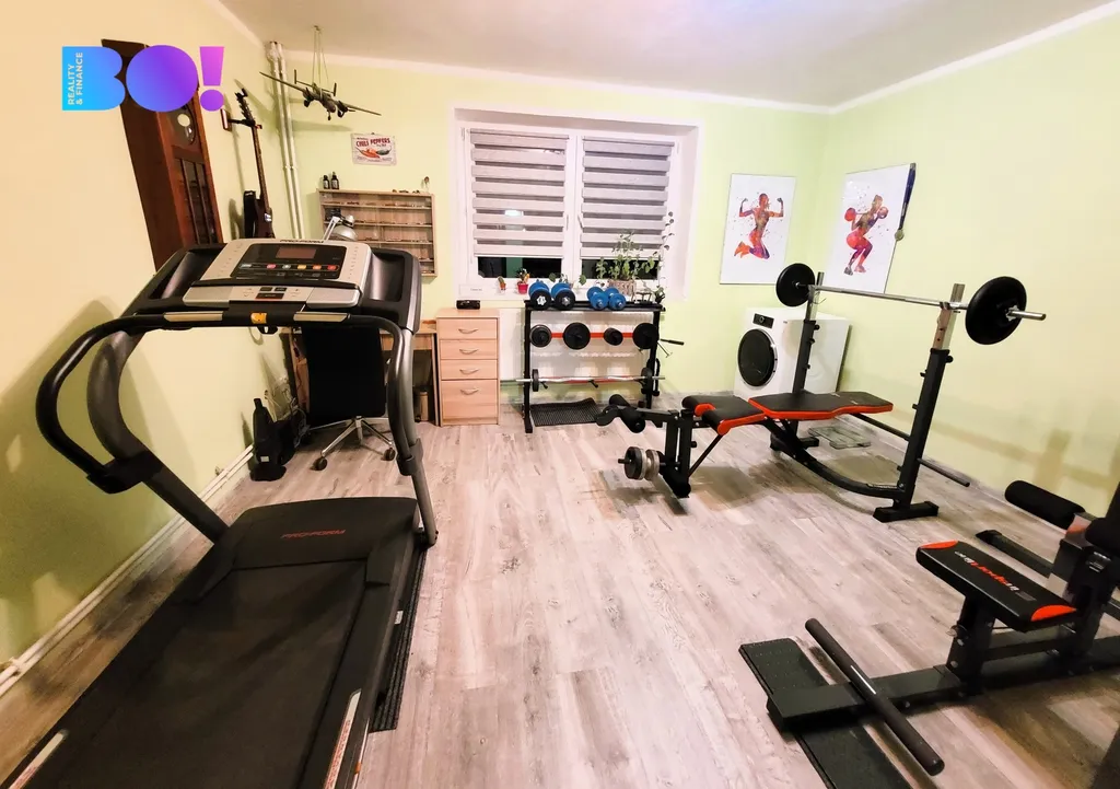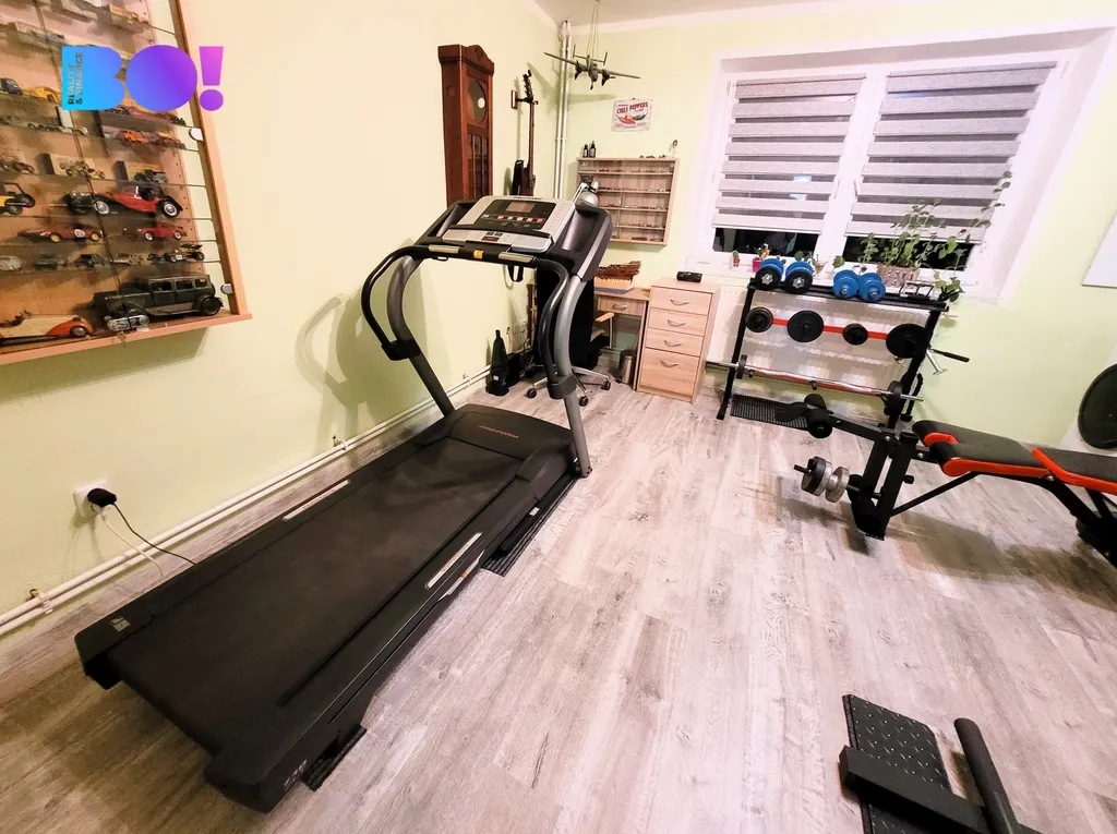 V prvním nadzemním podlaží se nachází zánovní kuchyňská linka s vestavěnými spotřebiči, mezi které patří elektrická trouba, mikrovlnná trouba, sklokeramická varná deska, digestoř a myčka nádobí. Kuchyň je prakticky propojena s obývacím pokojem, čímž vzniká příjemný a světlý prostor vhodný pro každodenní rodinný život. Součástí tohoto podlaží je také další pokoj, který lze využít jako pracovnu, hernu nebo pokoj pro hosty, v současnosti slouží jako posilovna. V tomto podlaží se dále nachází koupelna se sprchovacím koutem a samostatné wc.