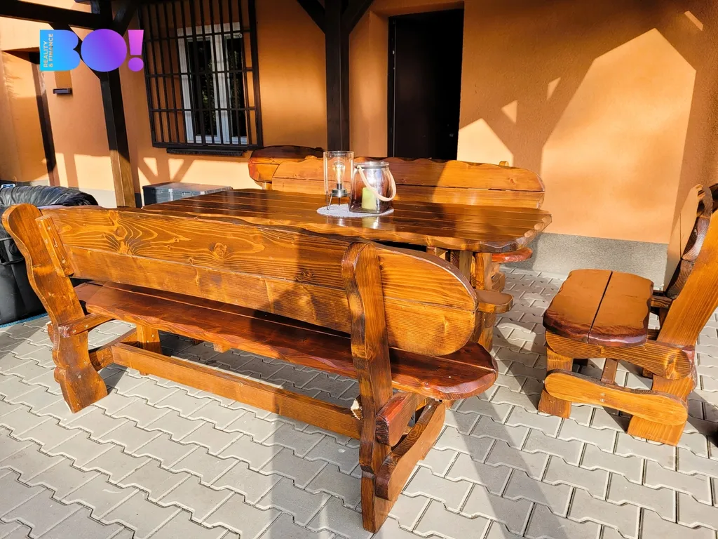 V zadní části domu se nachází velká terasa určená k posezení, která je vybavena dřevěným zahradním nábytkem a nabízí ideální místo pro relaxaci, rodinné posezení či grilování. Zahrada je udržovaná a nachází se zde menší hospodářská stavba, skleník, záhony i okrasná skalka.