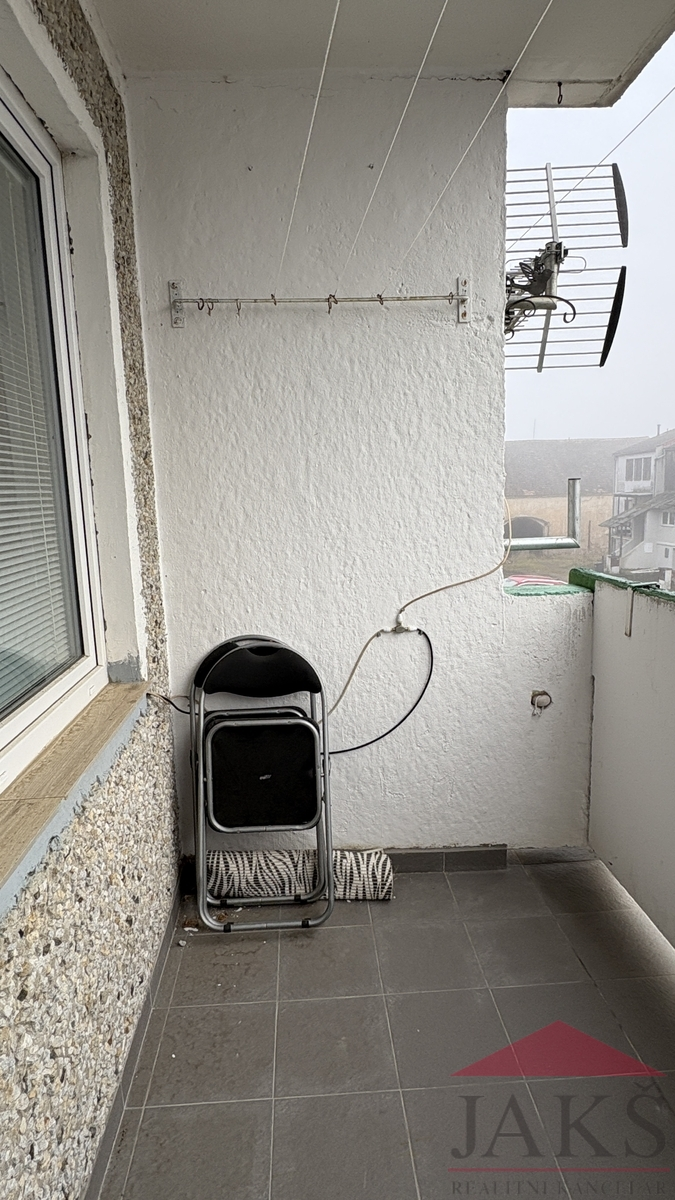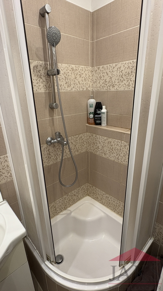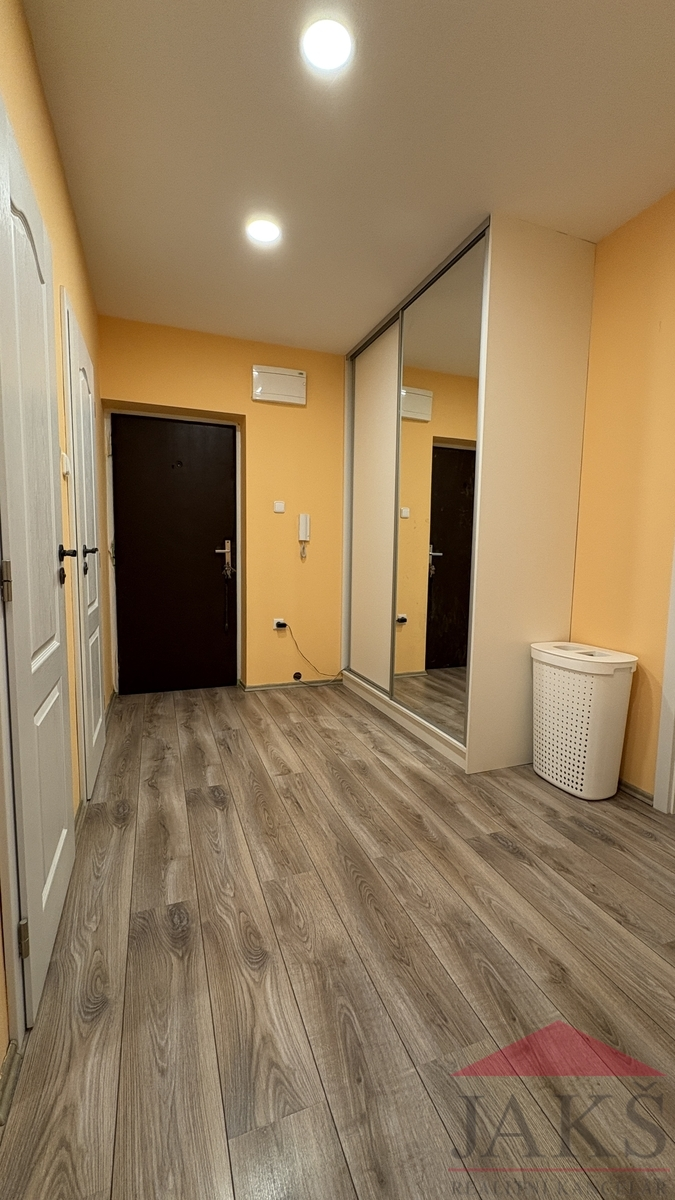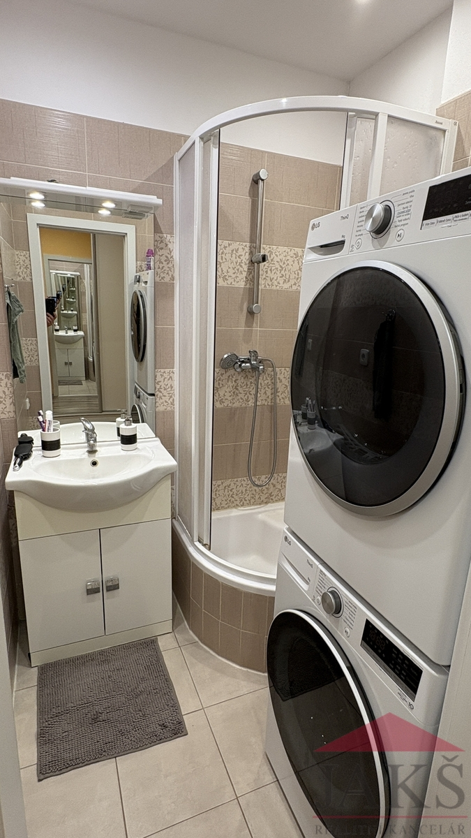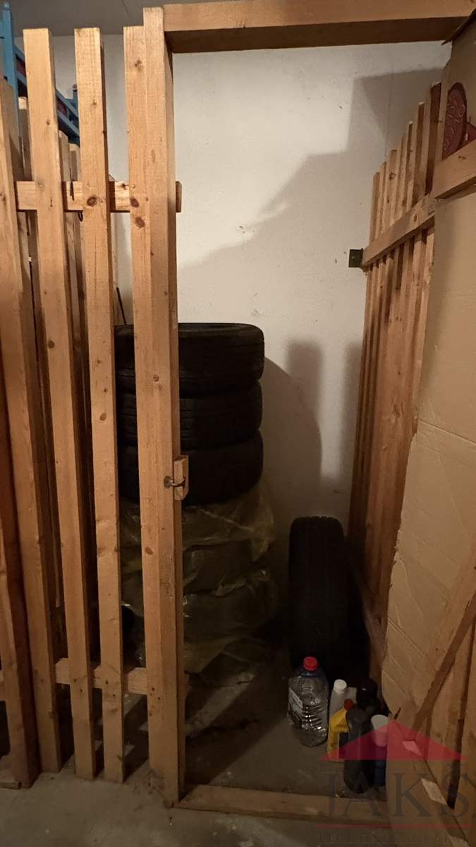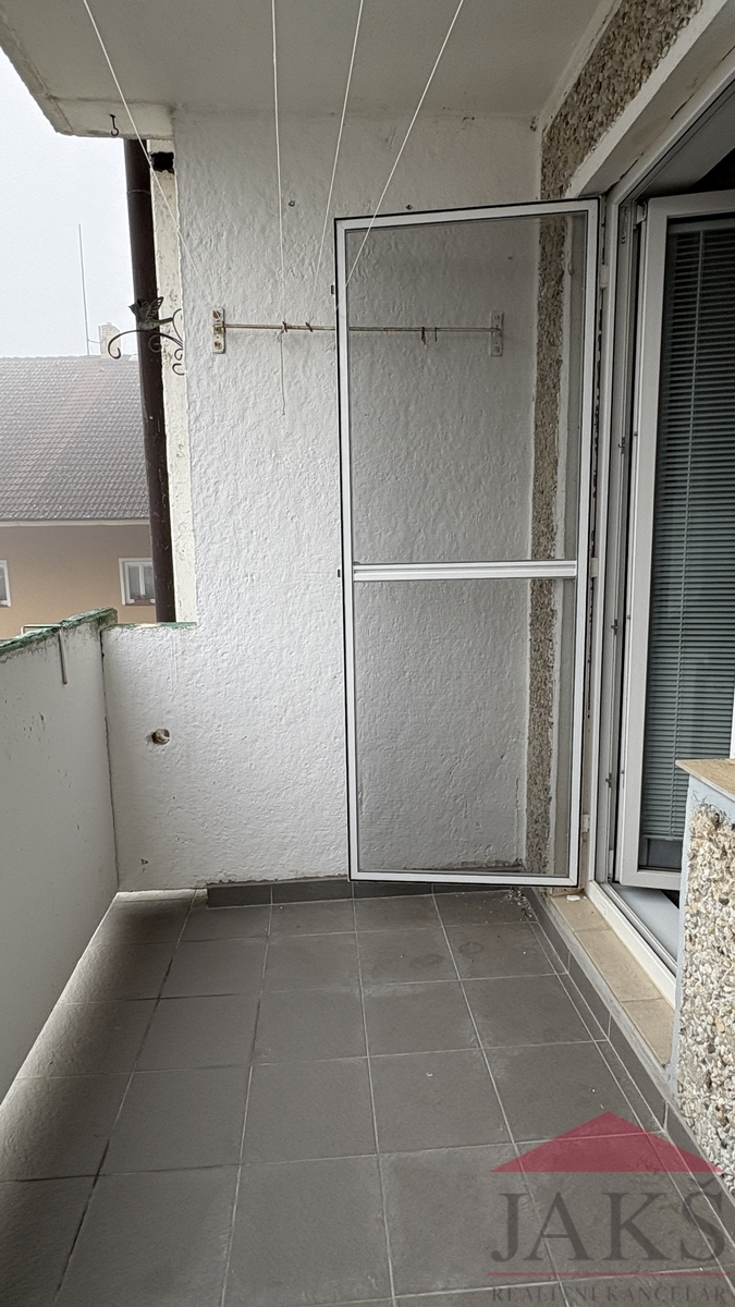 Popis: chodba (šatní skříň), koupelna (sprchový kout, umyv. se zrcadlem a skříňkou, vývody na pračku, bodové osvětlení), samostatné WC, kuchyň (rohová kuch. linka s HV troubou se sklo-ker. deskou, digestoří a myčkou) s jídelnou, 2x ložnice, prostorný obývací pokoj s velkou lodžií. K bytu náleží vlastní 2x sklepní kóje a spol. prostory (kolovna, sušárna a kotelna) v suterénu domu a parkování na pozemku SVBJ.